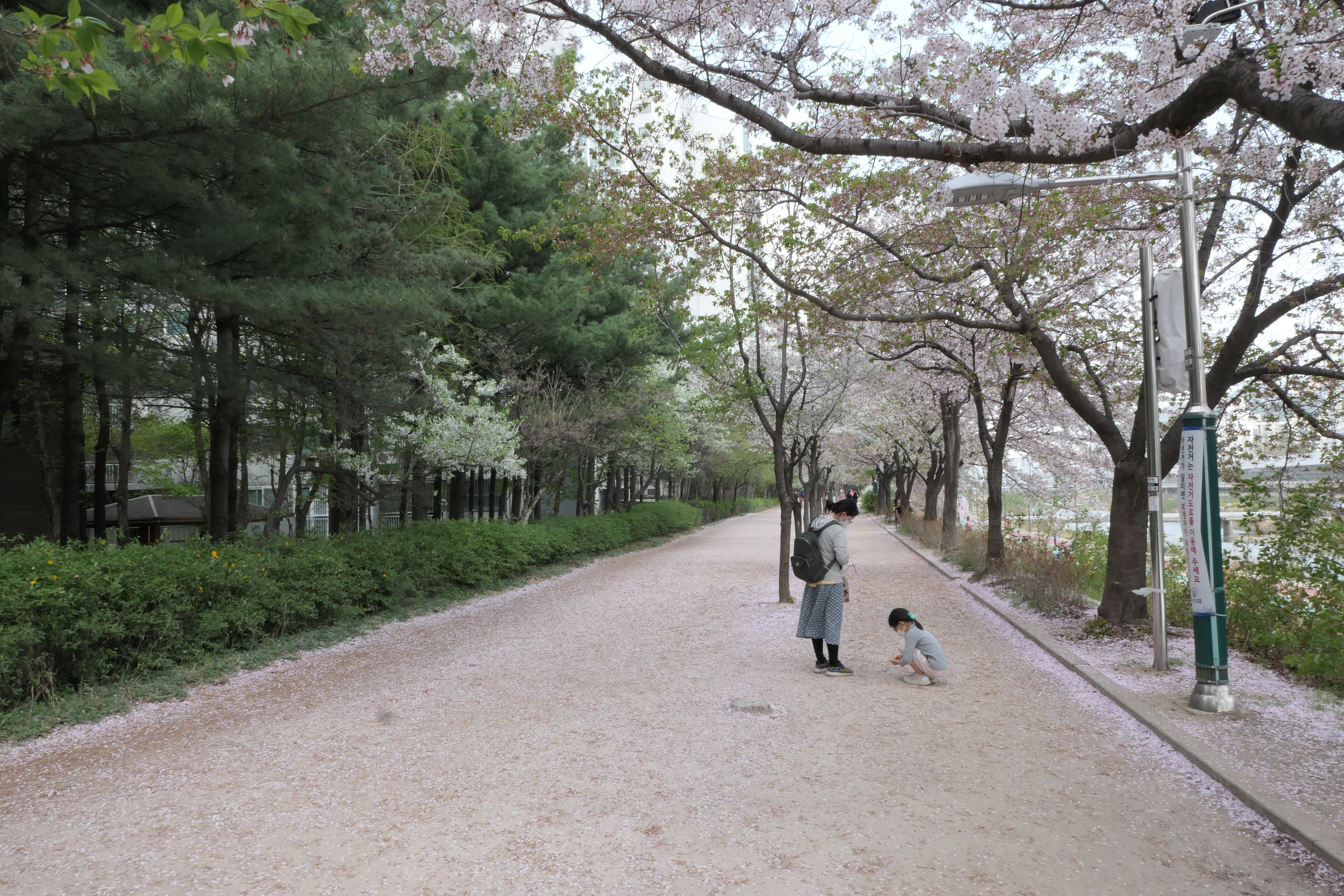 이제 벚꽃은 반가량 떨어져 어린 아이는 떨어진 벚꽃을 한 주먹 주워들어 보여준다.