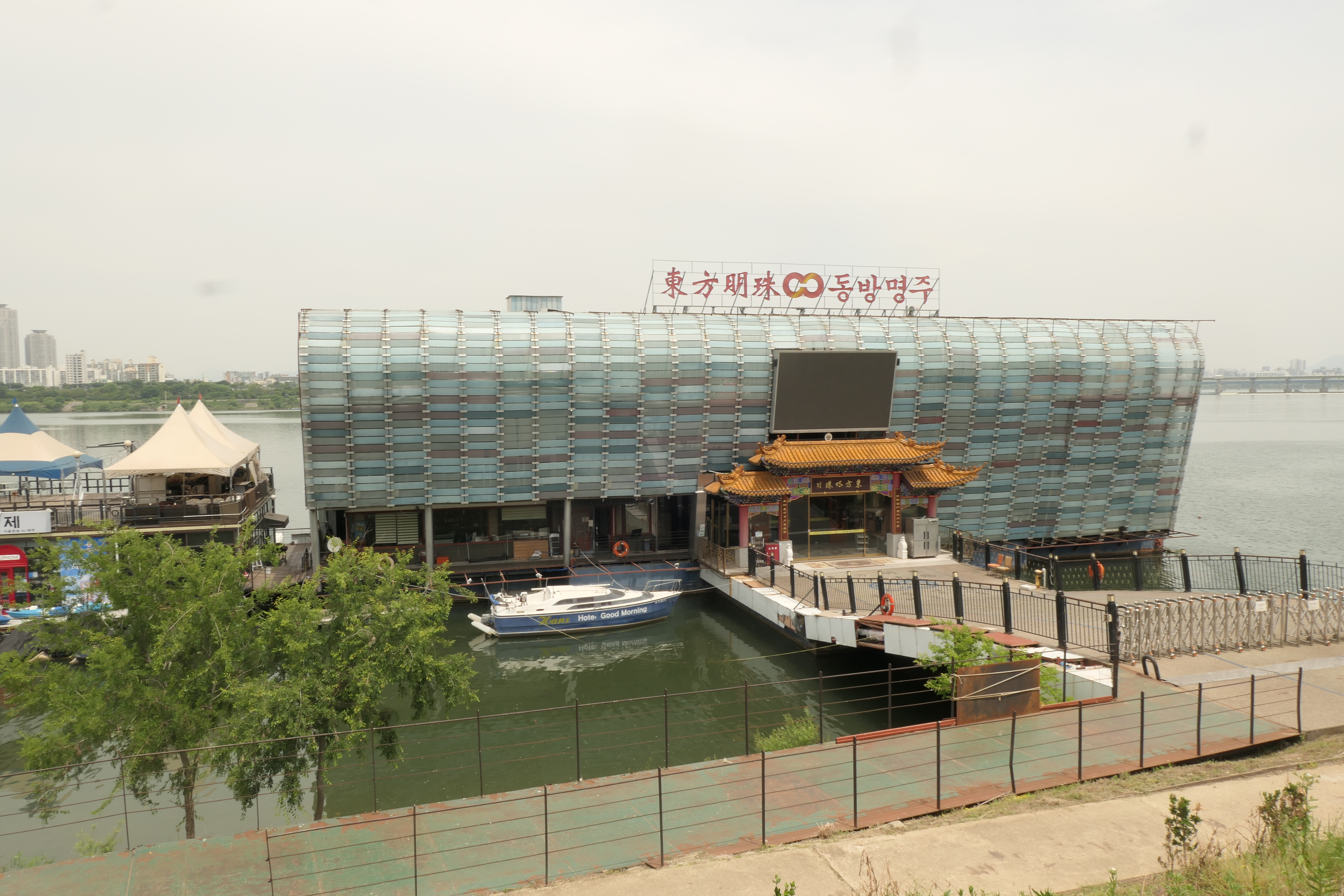 강변에는 중식당 동방명주 건물이 있는데 중국에서 은밀하게 운영하는 비밀경찰서라는 의혹을 받고 있는 곳으로 뉴스에 오르내린 적이 있는데 안에 사람들은 있으나 지금은 운영을 하지 않고 문이 닫혀 있었다.